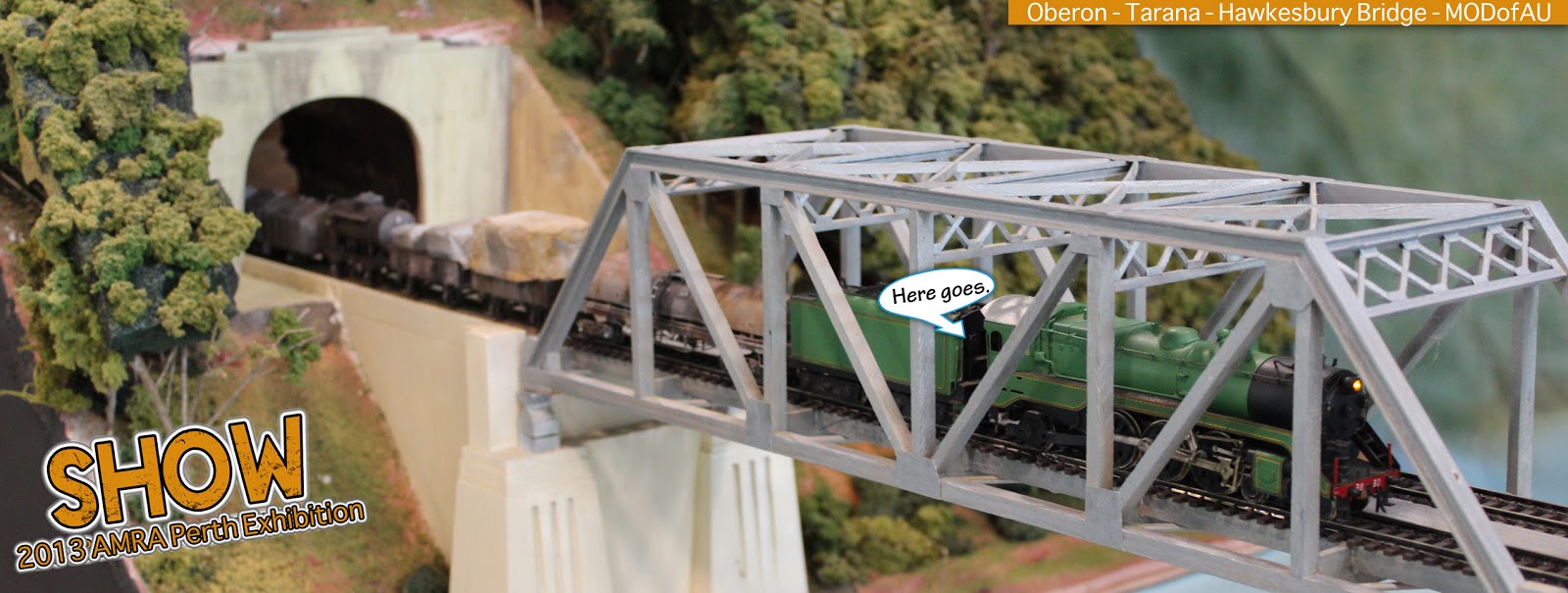 On the June long weekend each year, AMRA holds the Model Railway show at the Claremont Showgrounds. It is a very big show. As mentioned in previous posts, the ModofAu guys were presenting one layout, consisting of 3 parts - Oberon, Tarana and the Hawkesbury Bridge. This NSWGR layout was set around the 60's to 70's time era. Here are some photos capturing the weekend. Most photos were taken on Peter Higgins layout Oberon and features mostly my rolling stock and locos. Click on the photo's for much larger versions.